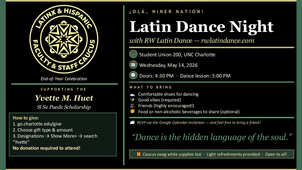 We are bringing RW Latin Dance (https://rwlatindance.com/) to UNC Charlotte’s Student Union, room 200, on May 14, 2026. This LHFS Caucus end-of-the-year event is open to anyone who wants to join us. We are specifically using this event to raise awareness and ask for support for the Yvette M. Huet Sí Se Puede Scholarship (https://lfsc.charlotte.edu/yvette-m-huet-sc3ad-se-puede-scholarship/).